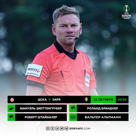 Матч 3-го тура группового этапа Лиги Конференций «ЦСКА» – «Заря» будет обслуживать судейская бригада из Австрии во главе с Мануэлем Шюттенгрубером.