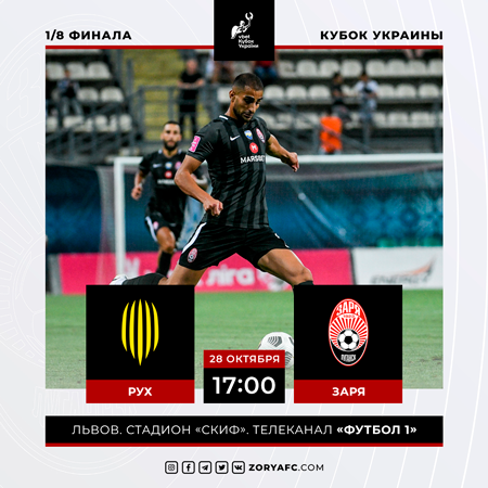 В четверг, 28-го октября, в рамках 1/8 финала Кубка Украины луганская «Заря» встретится со львовским «Рухом». Матч состоится во Львове на стадионе «СКИФ».