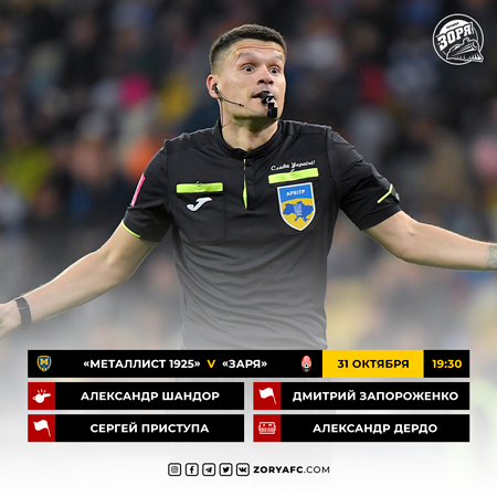 Комитет арбитров Украинской ассоциации футбола назначил для работы на матч 13-го тура УПЛ между луганской «Зарей» и «Металлистом 1925» судейскую бригаду во главе с Александром Шандором из Львова.