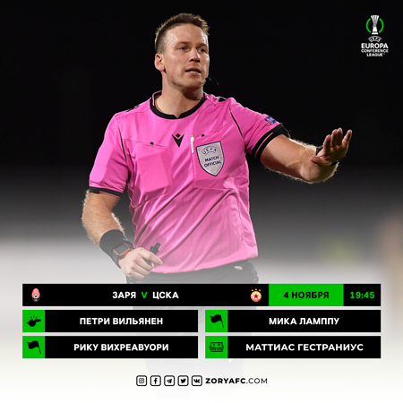 Матч 4-го тура группового этапа Лиги Конференций «Заря» – «ЦСКА» будет обслуживать судейская бригада из Финляндии во главе с Петри Вильяненом.