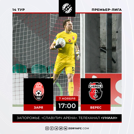 В воскресенье, 7-го ноября, в рамках 14-го тура Премьер-Лиги «Заря» встретится с «Вересом». Матч состоится в Запорожье на стадионе «Славутич Арена».
