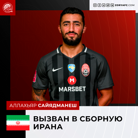 Нападающий луганской «Зари» Аллахьяр Сайядманеш вызван в сборную Ирана.