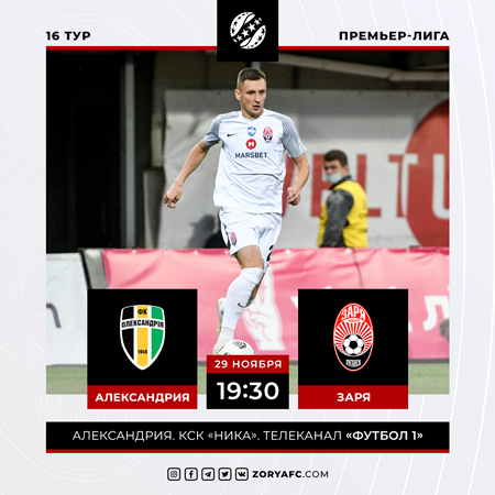 В понедельник, 29-го ноября, в рамках 16-го тура Премьер-Лиги «Заря» встретится с «Александрией». Матч состоится в Александрии на стадионе КСК «Ника».
