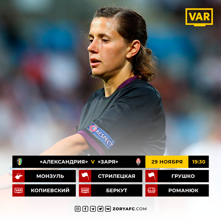 Комитет арбитров Украинской ассоциации футбола назначил для работы на матч 16-го тура УПЛ между «Александрией» и «Зарей» судейскую бригаду во главе с Екатериной Монзуль из Харькова.
