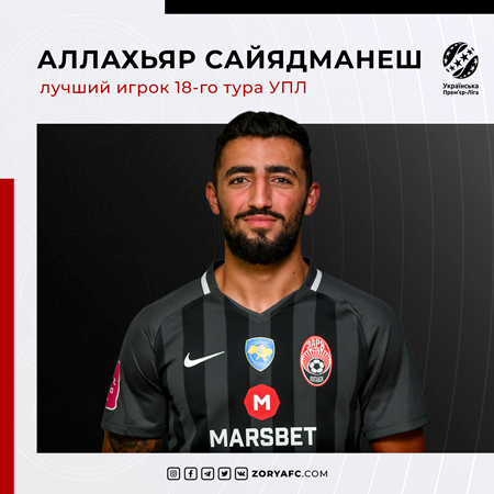 Нападающий луганской «Зари» Аллахьяр Сайядманеш признан лучшим игроком 18-го тура УПЛ.