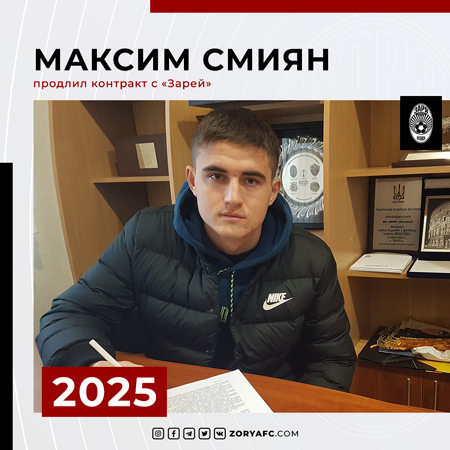 Футбольный клуб «Заря» Луганск и полузащитник U-19 Максим Смиян, который сейчас тренируется с основной командой, продолжили сотрудничество и подписали новый контракт, сообщает официальный сайт клуба.