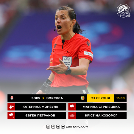 Комітет арбітрів Української асоціації футболу призначив для роботи на матч 1-го туру УПЛ між «Зорею» та «Ворсклою» суддівську бригаду на чолі з Катериною Монзуль із Харкова.