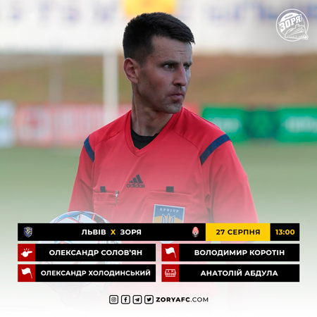 Комітет арбітрів Української асоціації футболу призначив для роботи на матч 2-го туру УПЛ між «Зорею» та «Львовом» суддівську бригаду на чолі з Олександром Солов’яном з Києва.