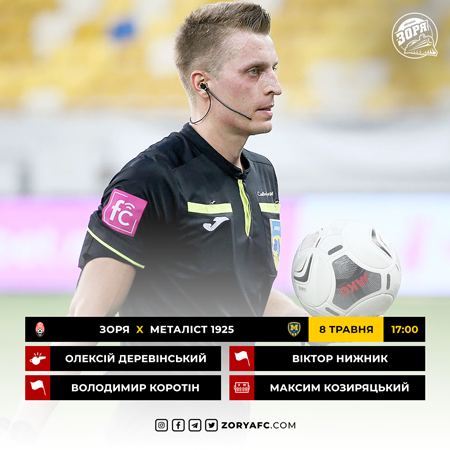 Комітет арбітрів Української асоціації футболу призначив для роботи на матч 25-го туру УПЛ між «Зорею» та «Металістом 1925» суддівську бригаду на чолі з Олексієм Деревінським з Хмельницкого.