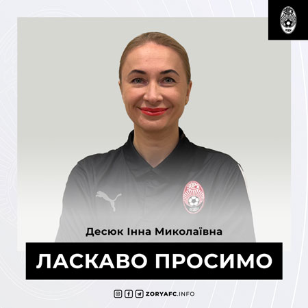 У луганській «Зорі» нова тренерка з фізичної підготовки, нею стала Десюк Інна Миколаївна.