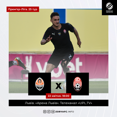 У понеділок, 22-го квітня, в рамках 25-го туру Прем’єр-Ліги «Зоря» зустрінеться з «Шахтарем». Матч відбудеться у Львові на стадіоні «Арена Львів».