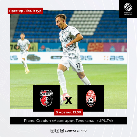 У суботу, 5-го жовтня, в рамках 9-го туру Прем’єр-Ліги «Зоря» зустрінеться з «Вересом». Матч відбудеться в Рівному на стадіоні «Авангард».