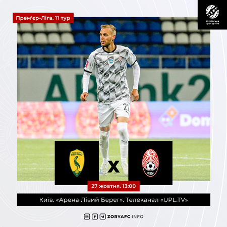 У неділю, 27-го жовтня, в рамках 11-го туру Прем’єр-Ліги «Зоря» зустрінеться з «Лівим Берегом». Матч відбудеться в Київській обл. на стадіоні «Арена Лівий Берег».