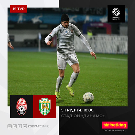 У п`ятницю, 5-го грудня, в рамках 15-го туру Прем’єр-Ліги «Зоря» зустрінеться з «Карпатами». Матч відбудеться в Києві на стадіоні «Динамо» ім. В. Лобановського.