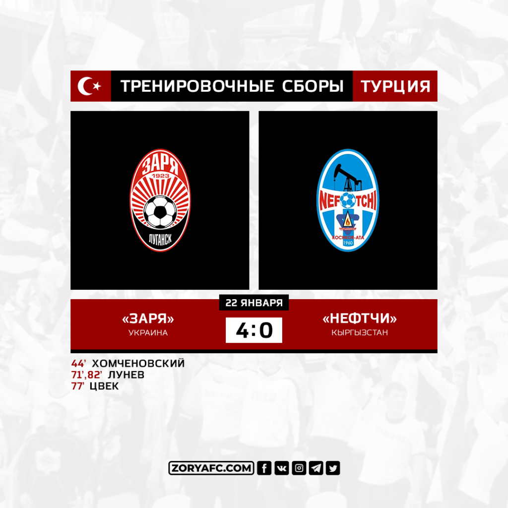 Сегодня у луганской «Зари» по расписанию два товарищеских матча. В первом поединке «черно-белые» встретились с клубом Премьер-лиги Киргизии – «Нефтчи». Игра закончилась победой луганчан с разгромным счетом (4:0).
