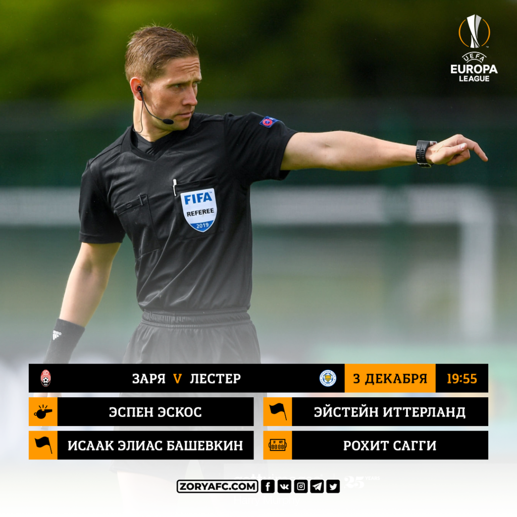 Матч 5-го тура группового этапа Лиги Европы «Заря» – «Лестер» будет обслуживать судейская бригада из Норвегии во главе с Эспеном Эскосом.