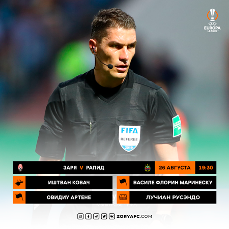 Ответный матч плей-офф раунда Лиги Европы «Заря» – «Рапид» будет обслуживать судейская бригада из Румынии во главе с Иштваном Ковачем.