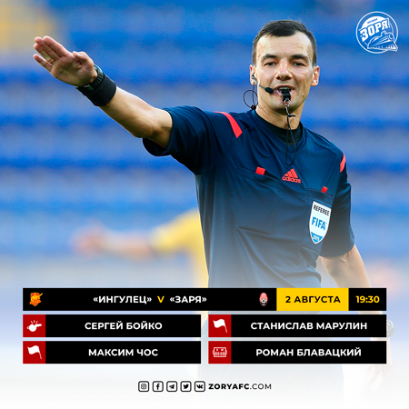 Комитет арбитров Украинской ассоциации футбола назначил для работы на матч 2-го тура Vbet Лиги между «Ингульцом» и «Зарей» судейскую бригаду во главе с Сергеем Бойко.