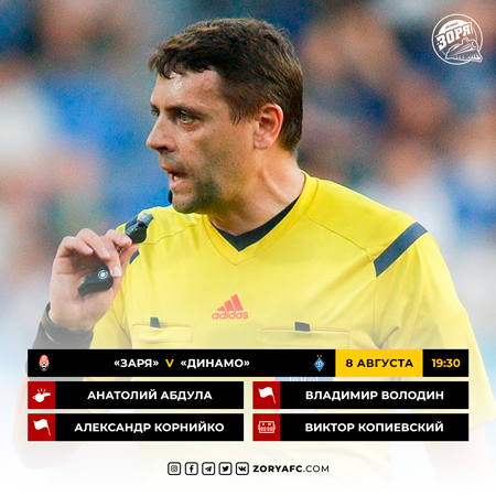 Комитет арбитров Украинской ассоциации футбола назначил для работы на матч 3-го тура УПЛ между луганской «Зарей» и киевским «Динамо» судейскую бригаду во главе с Анатолием Абдулой из Харькова.