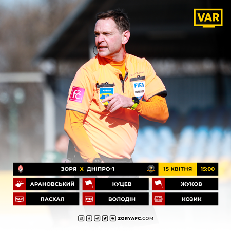 Комітет арбітрів Української асоціації футболу призначив для роботи на матч 21-го туру УПЛ між «Зорею» та «Дніпром-1» суддівську бригаду на чолі з Євгеном Арановським з Хмельницького.