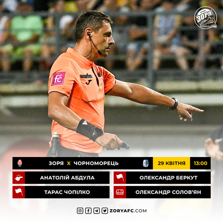 Комітет арбітрів Української асоціації футболу призначив для роботи на матч 23-го туру УПЛ між «Зорею» та «Чорноморцем» суддівську бригаду на чолі з Анатолієм Абдулою з Харкова.