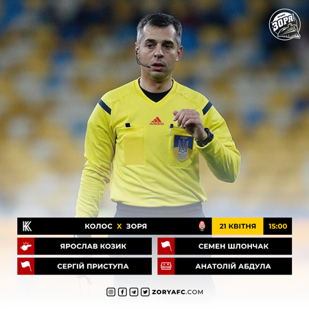 Комітет арбітрів Української асоціації футболу призначив для роботи на матч 22-го туру УПЛ між «Колосом» та «Зорею» суддівську бригаду на чолі з Ярославом Козиком з Мукачево.