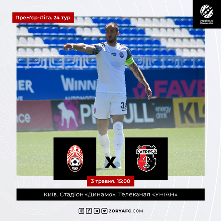 У середу, 3-го травня, в рамках 24-го туру Прем’єр-Ліги луганська «Зоря» зустрінеться з рівненським «Вересом». Матч відбудеться у Києві на стадіоні «Динамо» ім. В. Лобановського.