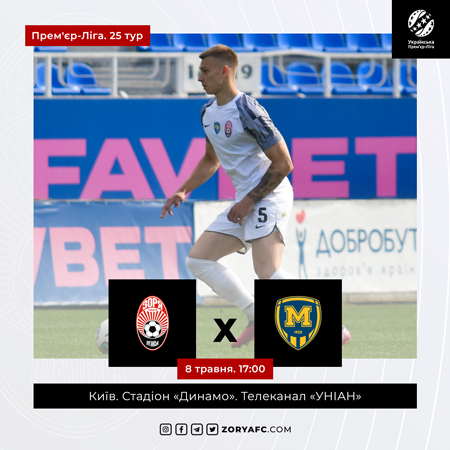 У понеділок, 8-го травня, в рамках 25-го туру Прем’єр-Ліги «Зоря» зустрінеться з «Металістом 1925». Матч відбудеться у Києві на стадіоні «Динамо» ім. В. Лобановського.