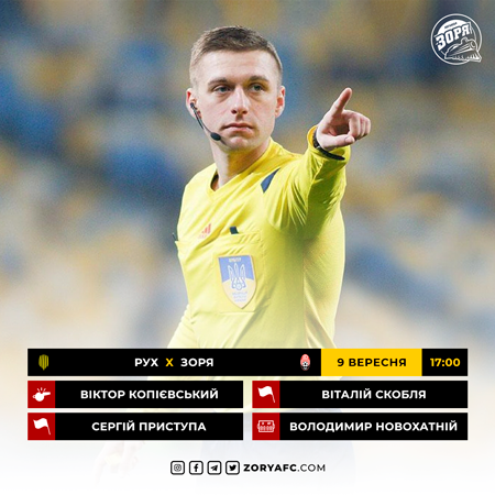 Комітет арбітрів Української асоціації футболу призначив для роботи на матч 4-го туру УПЛ між львівським «Рухом» та луганською «Зорею» суддівську бригаду на чолі з Віктором Копієвським з Кропивницького.
