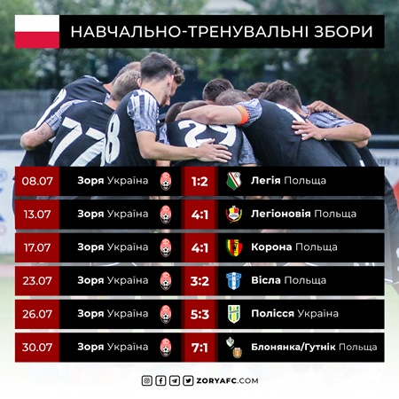 Луганська «Зоря» провела на навчально-тренувальному зборі у Польщі шість матчів, у яких здобула п’ять перемог і один матч закінчився поразкою луганчан. Забили 24 голи та пропустили 10 м’ячів.